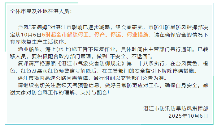 今年的第21台台风“ Medham”中心于10月5日下午2:50到达了Zhanjiang City的东海岸。它远离Zhanjiang,其强度逐渐减弱。随着风暴的影响消退,许多Zhanjiang部门发布了通知,澄清说,“五个暂停”步骤将从10月6日起提出,劳动和生活将在适当的情况下恢复。该市从10月6日的6:00开始提出“五个停赛”。咨询和研究后,Zhanjiang市政洪水控制和干旱控制司令部将提升措施,以暂停该市的就业,工作,运营和业务。扬江其他地方的公民和人们可以在确保安全的同时正确恢复正常的生产和生活。 Labash(Water)中的渔业和建筑船将目前不继续操作,并且特定时间将通过主管部门分别给予。移动的人员应该激活y与政府部门的管理层合作,以实现“不安全而没有返回”。请严格遵循“ Zhanjiang City气象预防灾难法规”的第28条,以恢复课程。在升起了风暴黄色,橙色,红色和强风暴的红色警告信号之后,在主管当局的安全指南下提出了悬架步骤。一些桥梁恢复了交通,将宣布走廊的通行时间。跨海桥的状态:10月6日凌晨4点,Zhanjiang Bay桥,Donghai Island Bridge和Tiaoshun Cross-Sea Bridge完成了安全检查,正常Trapiko继续进行。由于需要进行额外的安全评估,因此需要进行波图以南的三座桥梁,因此需要继续关闭和控制。延续的特定时间分别表示。在关闭期间,经过的车辆和行人必须计划他们的旅行路线合理。痕量交通状况:由于需要在Zhanjiang市进行障碍物清洁,交通还原的具体时间将受到交通管理部门发布的公告。 Zhanjiang Wuchuan国际机场的航班继续于10月6日进行正常行动。经过全面的检查,Zhanjiang Wuchuan国际机场达到了空气经济状况。所有航班恢复了正常行动,10月6日。第一次来电将于下午6点到达。要求乘客注意航班更新,并可以通过官方飞机渠道,票务平台或致电机场服务热线(0759-8210000)查看实时航班信息。在前往机场之前,您需要注意有关道路入口和桥梁,保留大量时间并合理调整行程的最新交通管理信息。南部网络西克斯的广东学习记者